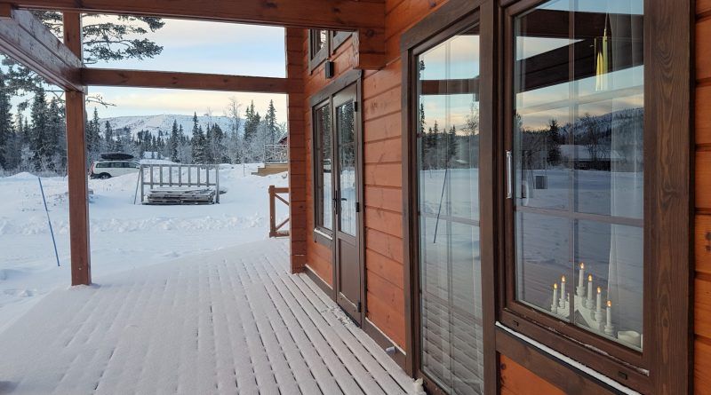 Entrada comercial en el pirineo Frances. El acabado foliado de madera da elegancia y estanqueidad